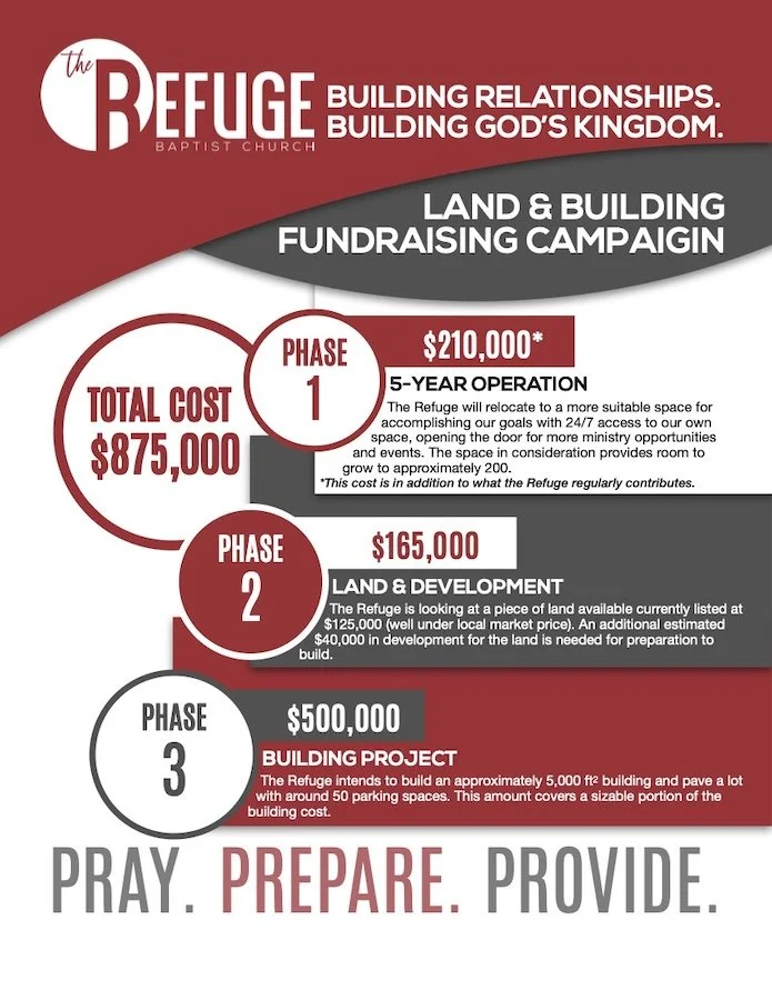 In order to move forward, one of the things needed to accomplish our mission is a place of our own to call home. That is why we are stepping out in faith by pursuing renting a storefront in our community along with the purchase of a property. In this step of faith, we are humbly asking for your grace of giving: you and others like you sharing through your generosity. In doing so, you along with other churches, organizations, and individuals help us financially offset the cost so we can more effectively reach people with the Gospel and do our part in building God’s Kingdom. What is our goal? Our plan for both projects is to raise $875,000 over the next 5 years.